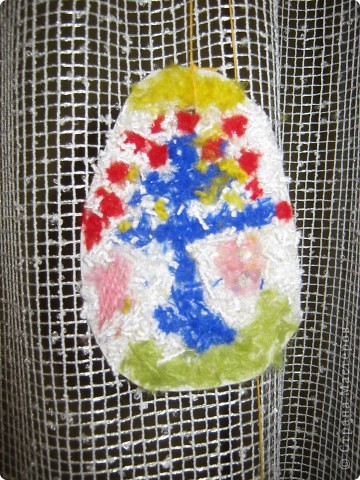 Подготовку к Пасхе мы началаи заблаговременно.Дети болели гриппом, сын не ходил в школу и нужно было чем-то занимать их.Вот и начали творить.На готовые шаблоны яиц и цыплят дети клеили нарезанные нитки, пластилин,сами фантазировали.Долго думали,куда повесить наши работы, решили украсить окно на кухне